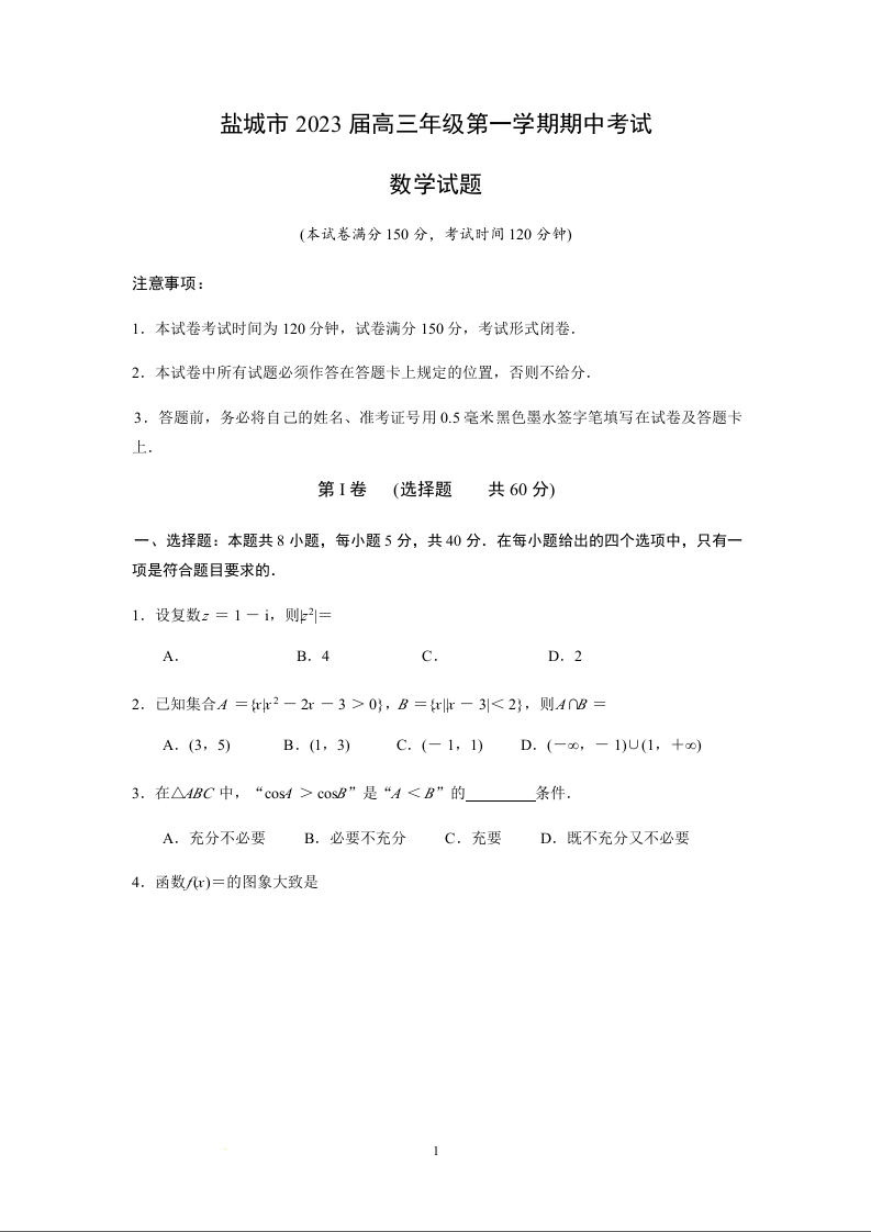 高三数学--江苏省盐城市2023届高三上学期期中考试