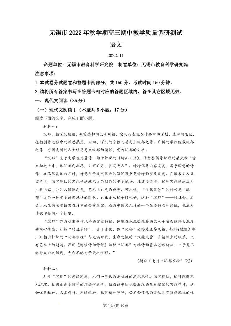 高三语文答案--江苏省无锡市2023届高三上学期期中考试