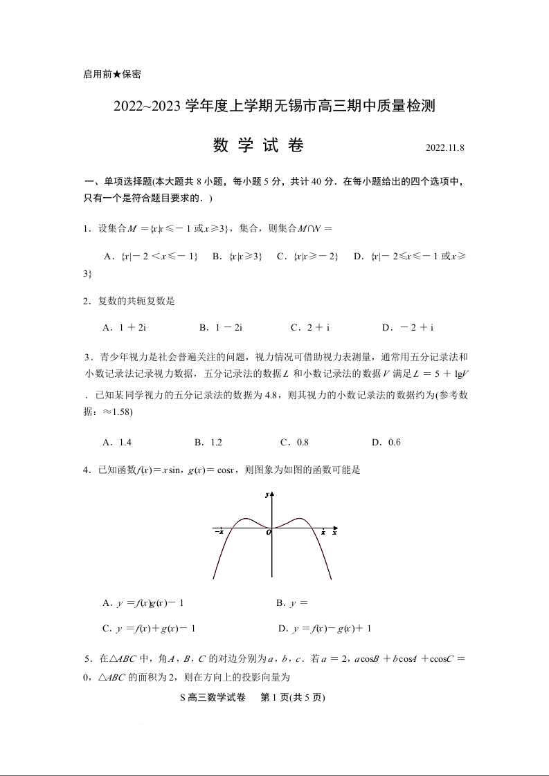 高三数学--江苏省无锡市2023届高三上学期期中考试