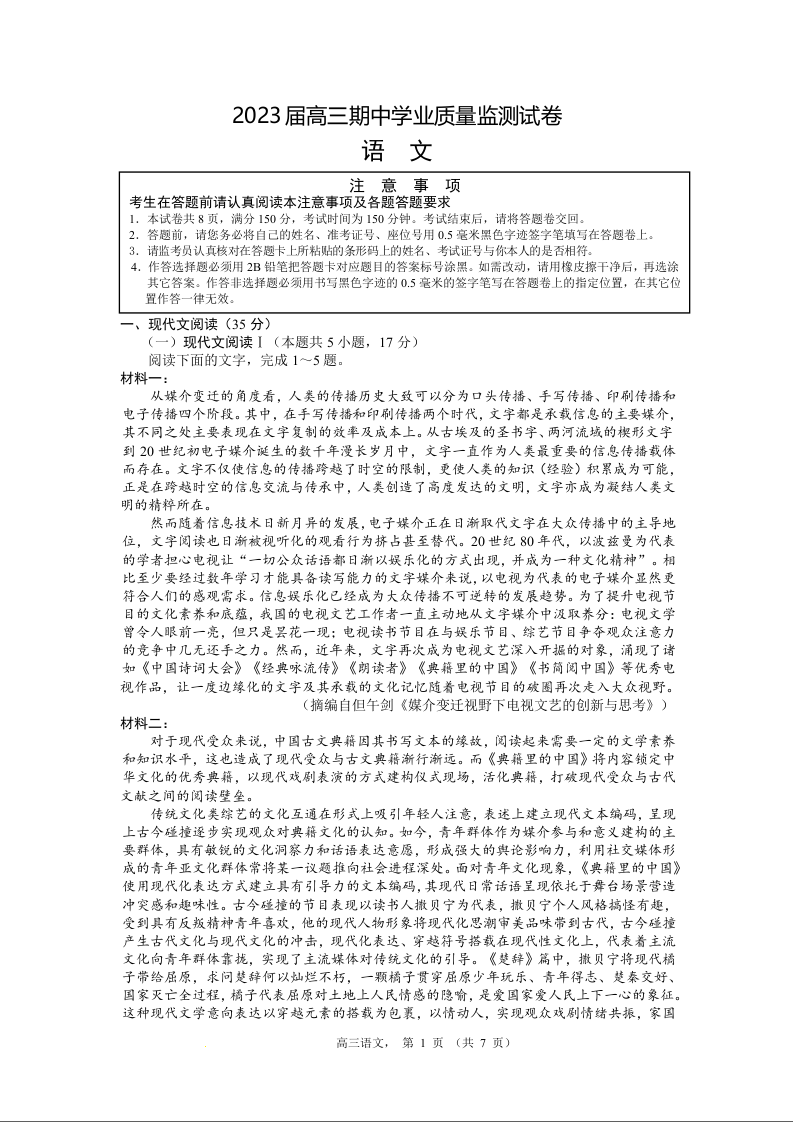 高三语文--江苏省南通市海安市2023届高三上学期期中考试