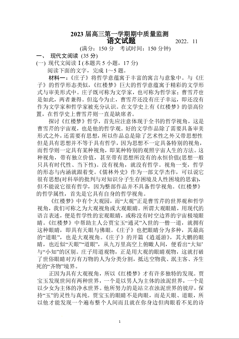 高三语文--江苏省南通市2023届高三上学期期中质量监测