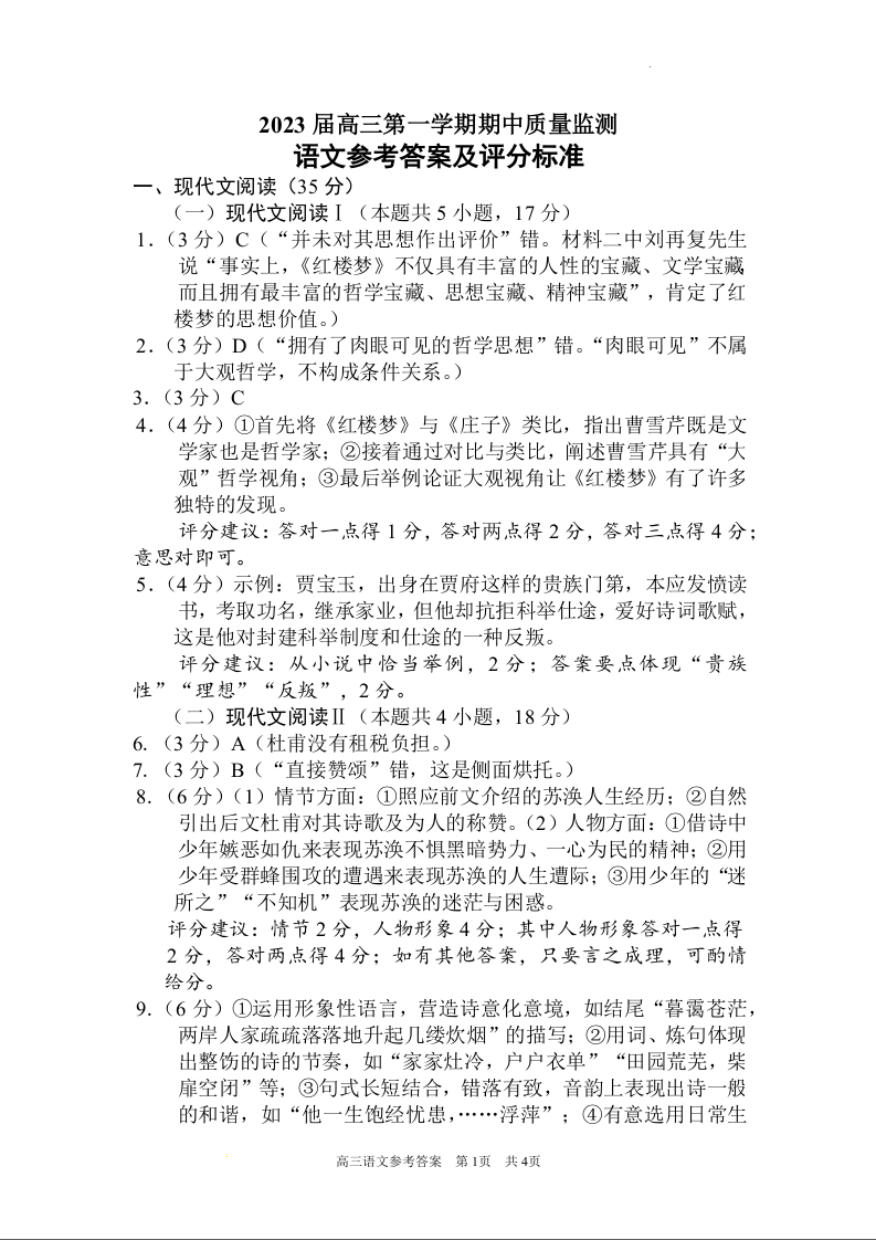 高三语文答案--江苏省南通市2023届高三上学期期中质量监测