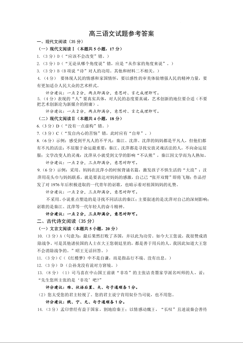 高三语文答案--江苏省南京市五校2023届高三上学期期中联考