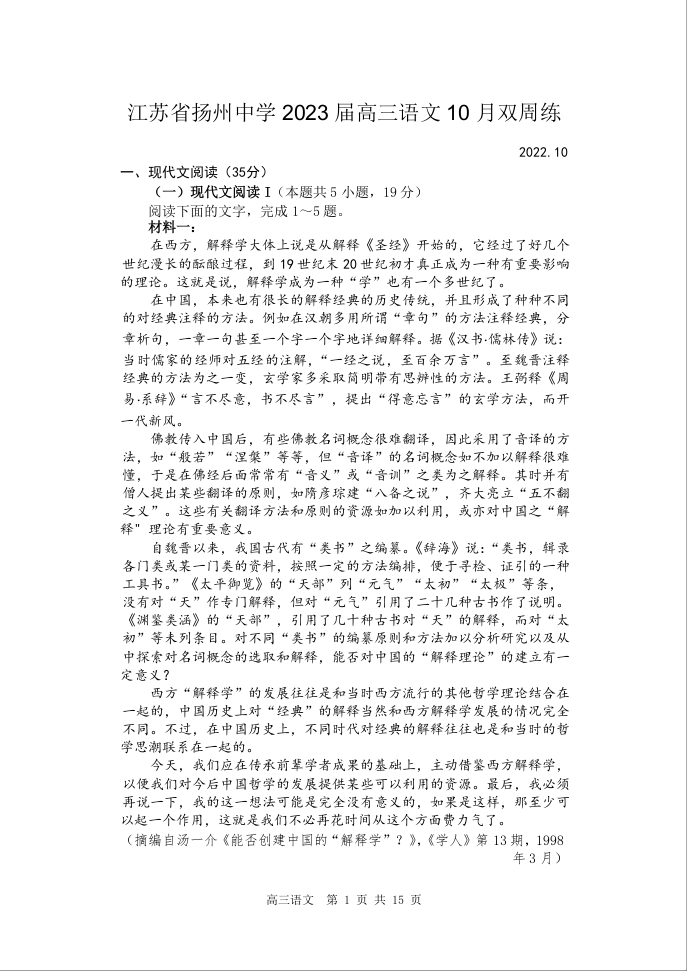 高三语文+答案--江苏省扬州中学2023届高三上学期10月双周练(三)