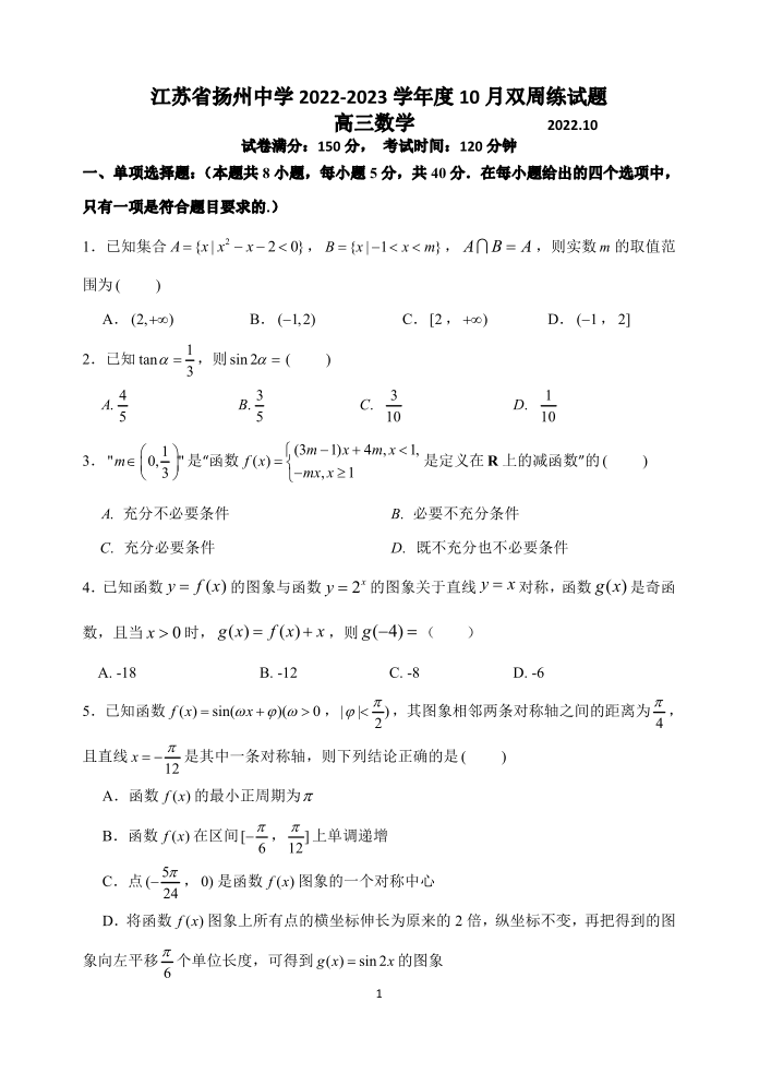 高三数学--江苏省扬州中学2023届高三上学期10月双周练(三)
