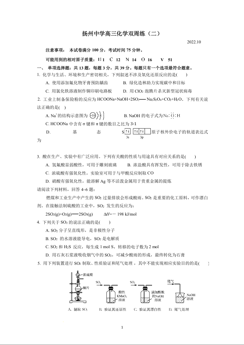 高三化学+答案--江苏省扬州中学2023届高三上学期10月双周练