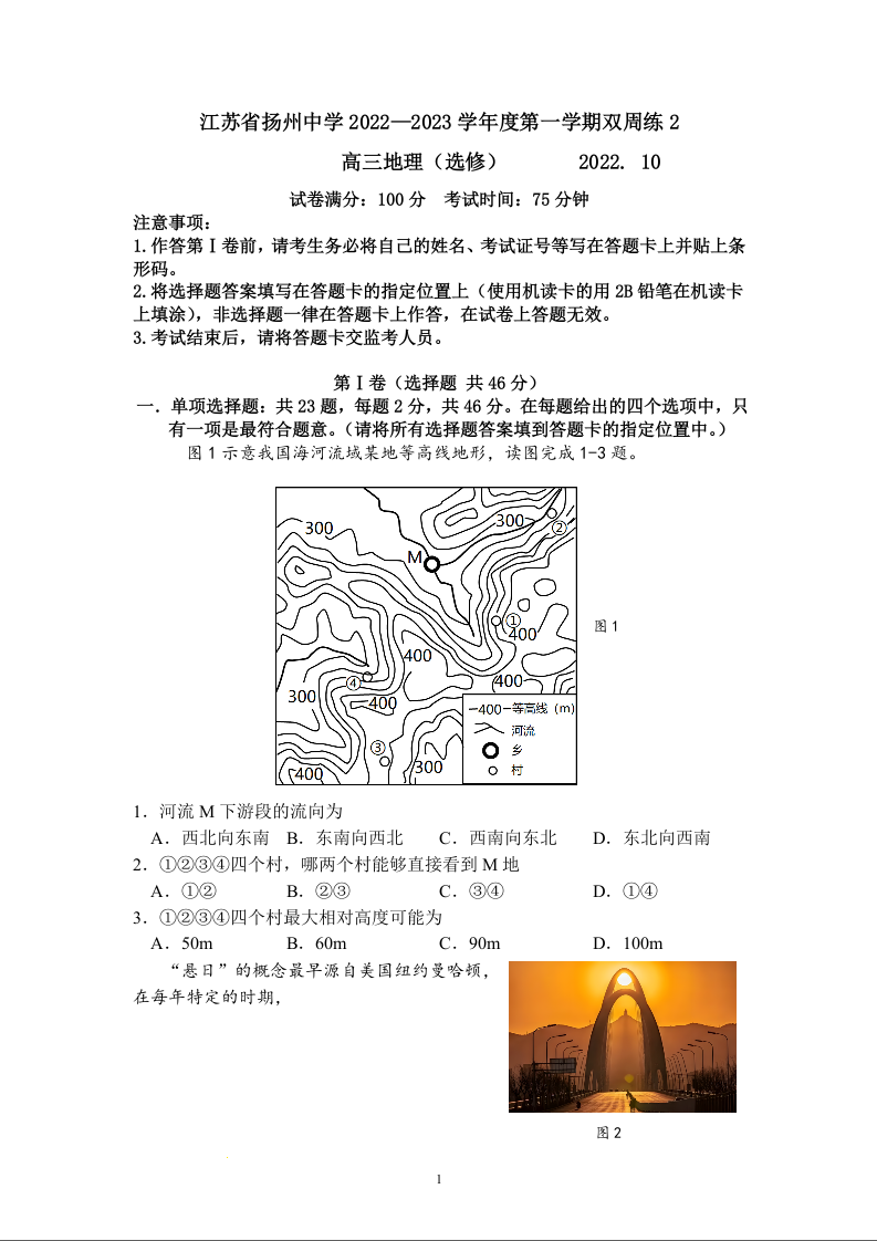 高三地理--江苏省扬州中学2023届高三上学期10月双周练