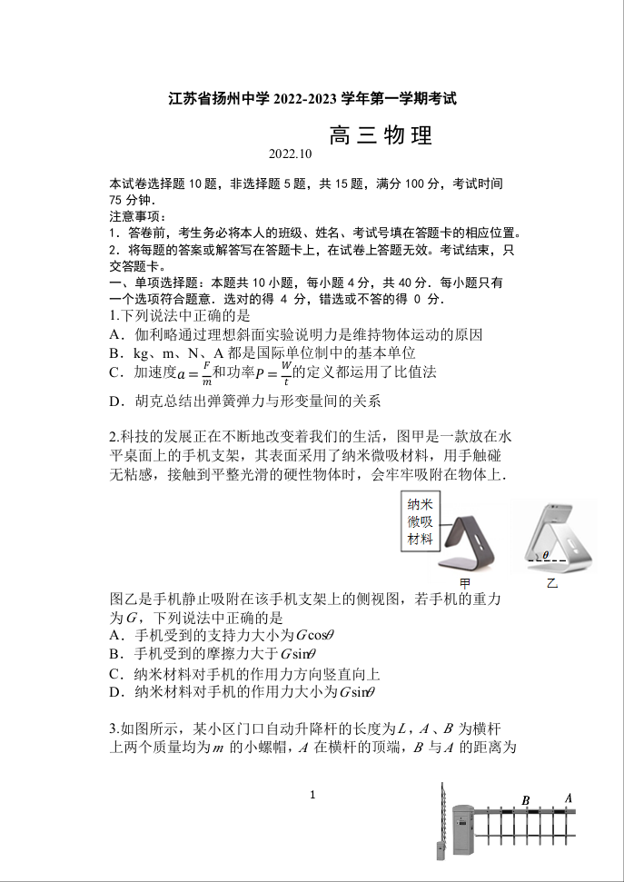 高三物理--江苏省扬州中学2023届高三上学期10月月考