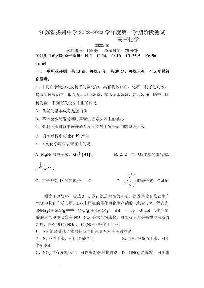 高三化学+答案--江苏省扬州中学2023届高三上学期10月月考
