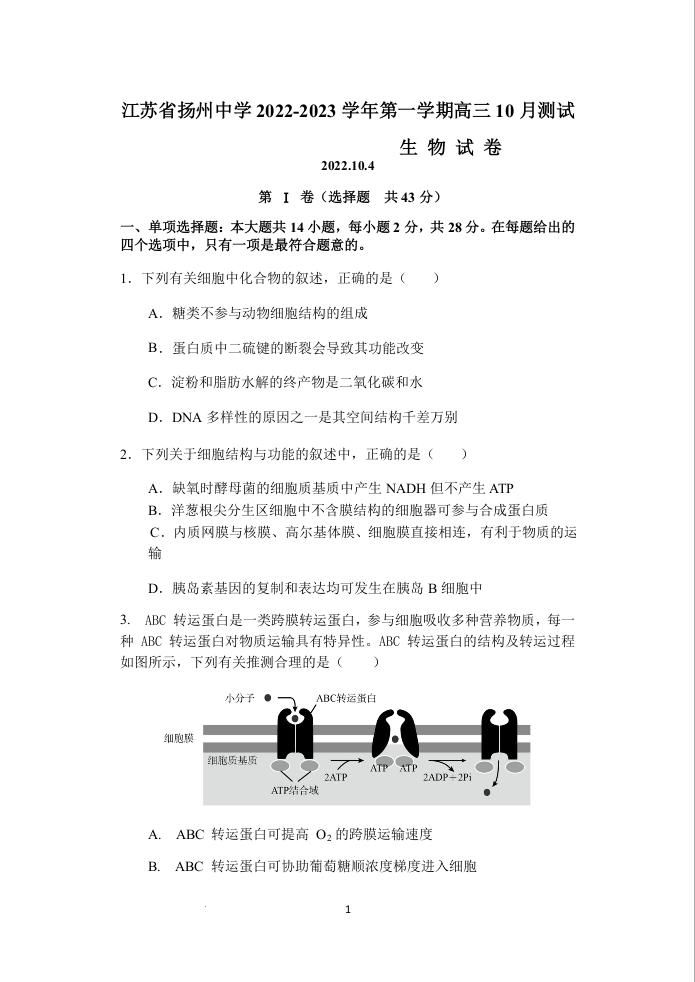 高三生物+答案--江苏省扬州中学2023届高三上学期10月月考