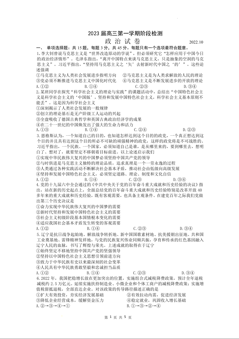高三政治--江苏省扬州中学2023届高三上学期10月月考