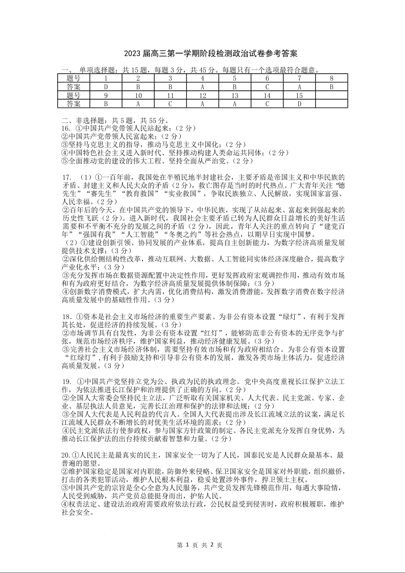 高三政治答案--江苏省扬州中学2023届高三上学期10月月考