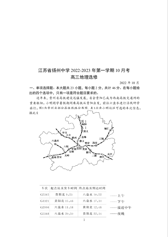 高三地理+答案--江苏省扬州中学2023届高三上学期10月月考