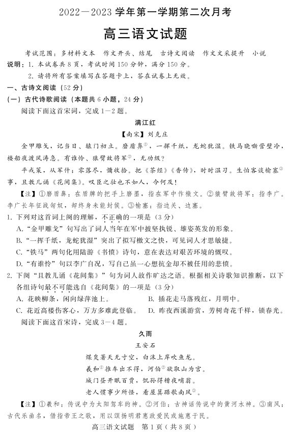 高三语文--河北省邢台市五校联考2023届高三上学期期中考试