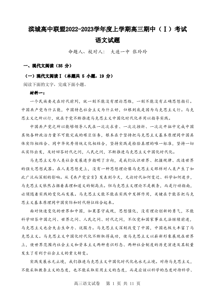 高三语文--辽宁省大连市滨城联盟2023卷高三上学期期中考试