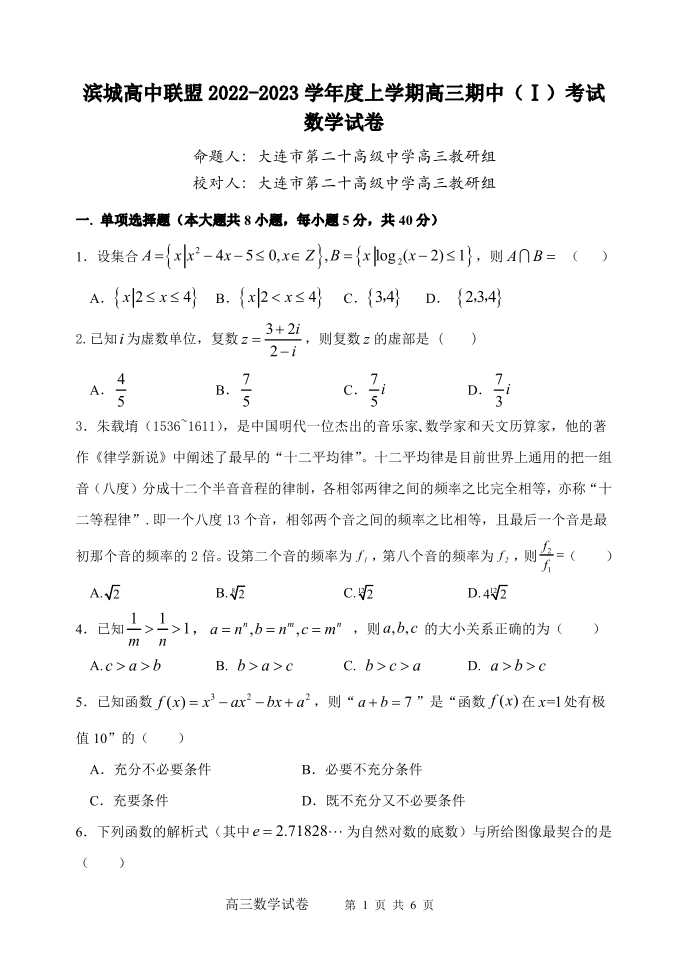 高三数学--辽宁省大连市滨城联盟2023卷高三上学期期中考试