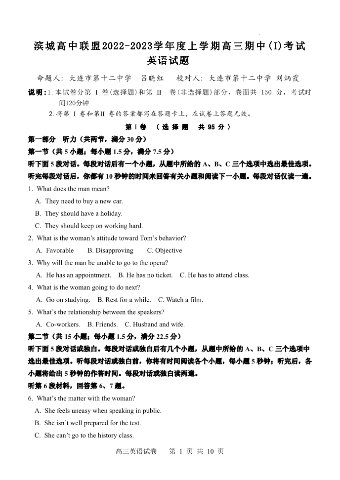 高三英语--辽宁省大连市滨城联盟2023卷高三上学期期中考试