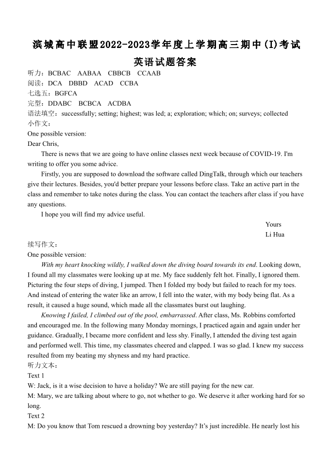 高三英语答案--辽宁省大连市滨城联盟2023卷高三上学期期中考试