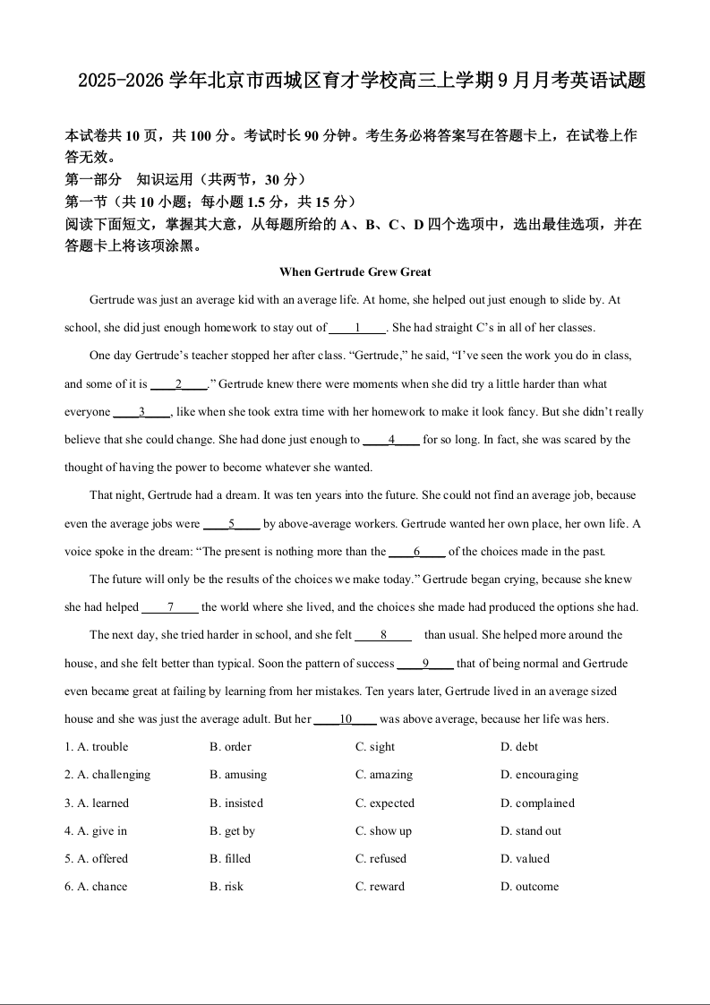 高三英语+答案--北京市西城区育才学校2026届高三上学期9月月考