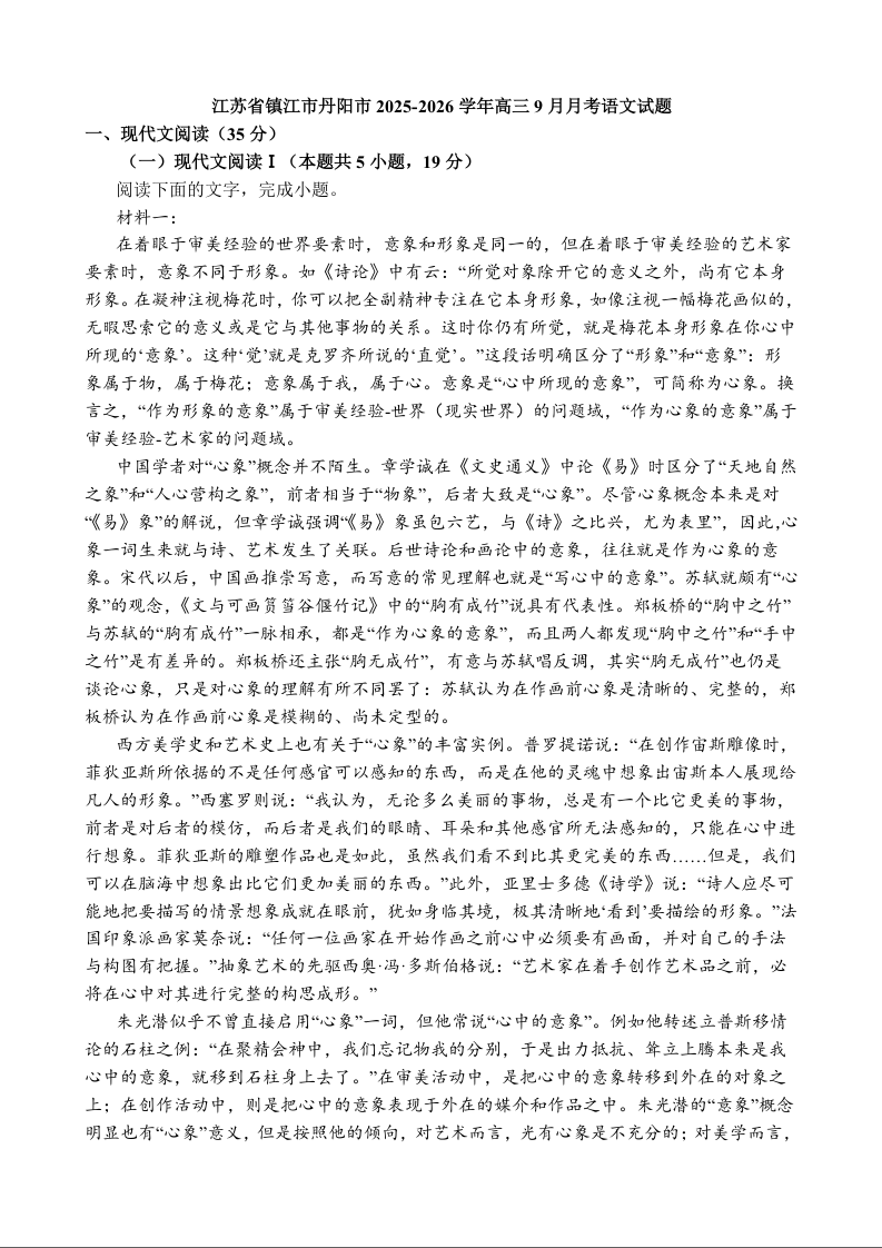 高三语文--江苏省镇江市丹阳市2026届高三上学期9月质量检测