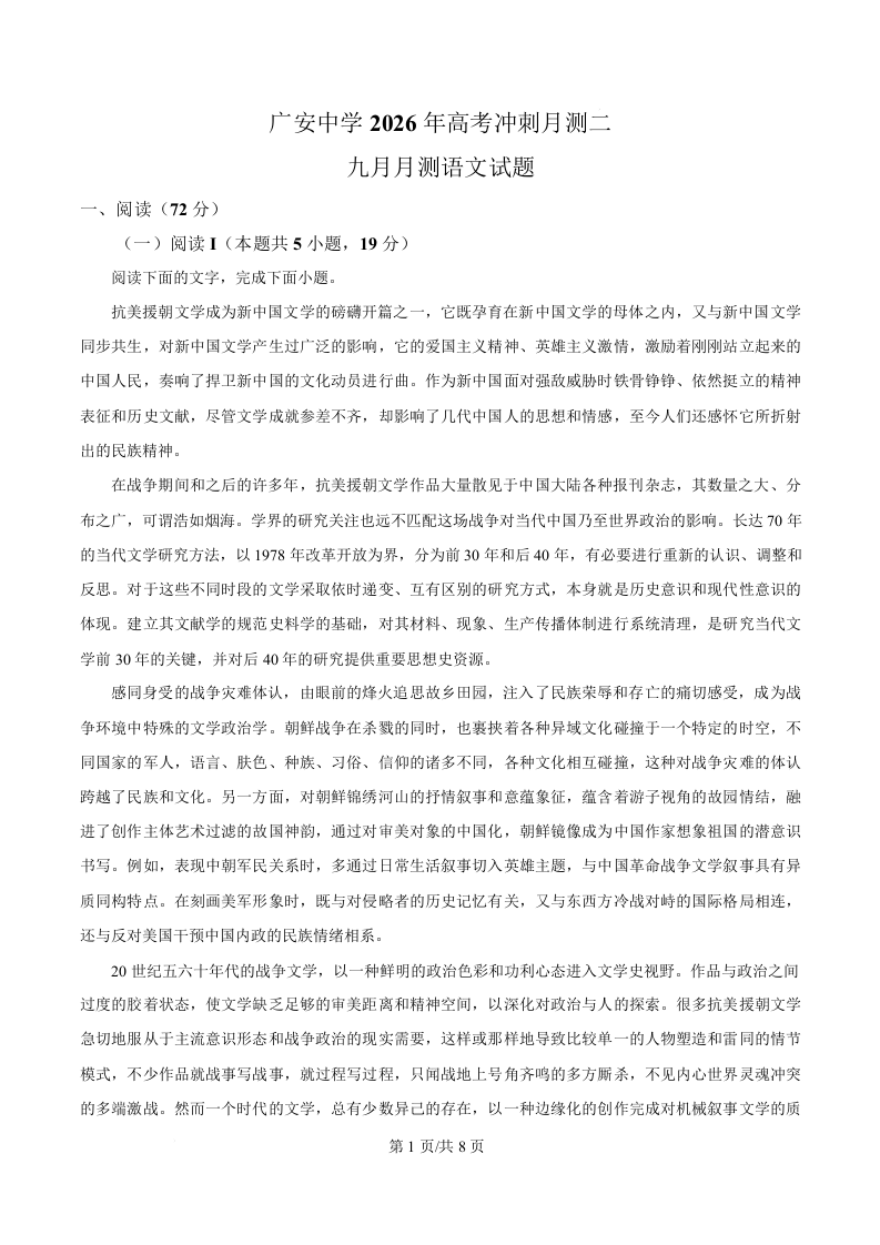 高三语文(原卷版)--四川省广安中学2025-2026学年高三上学期高考冲刺月测二(9月)