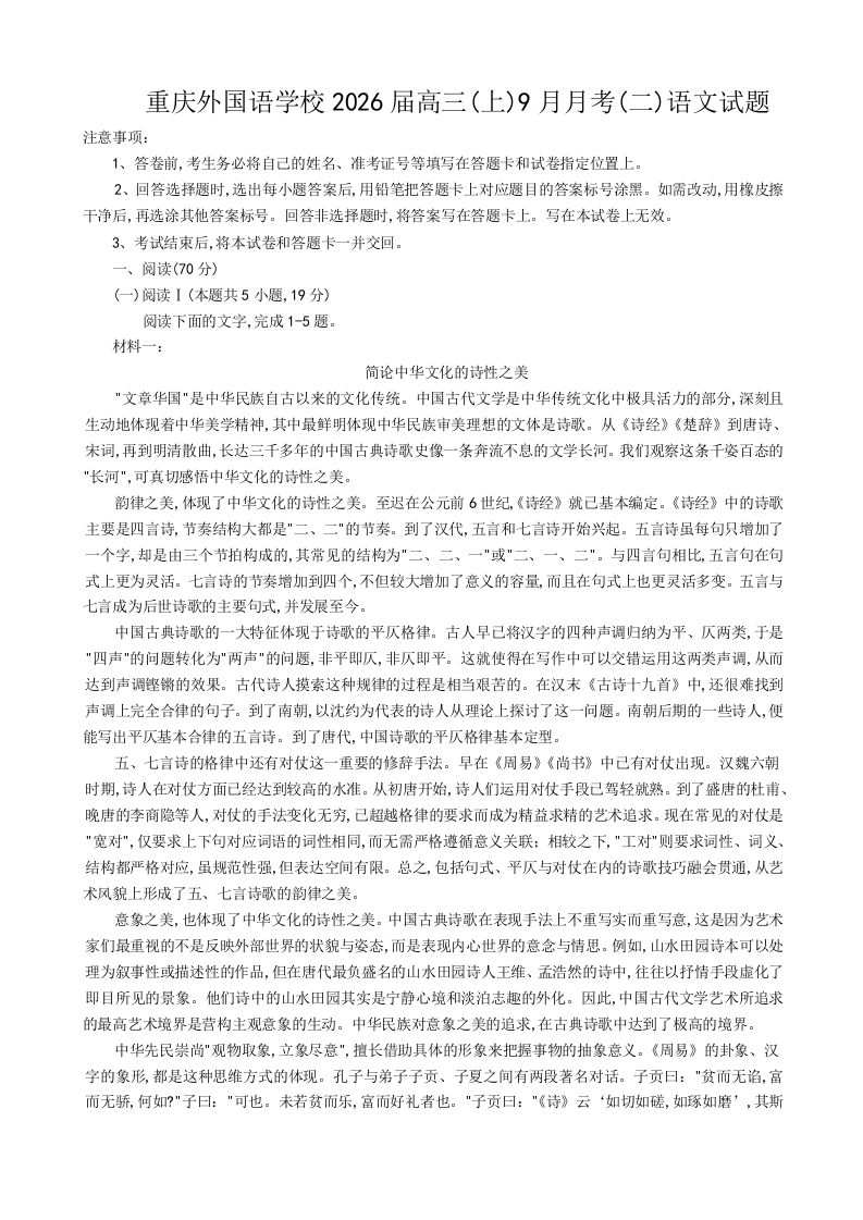 高三语文+答案--重庆实验外国语学校2026届高三上学期9月月考(二)