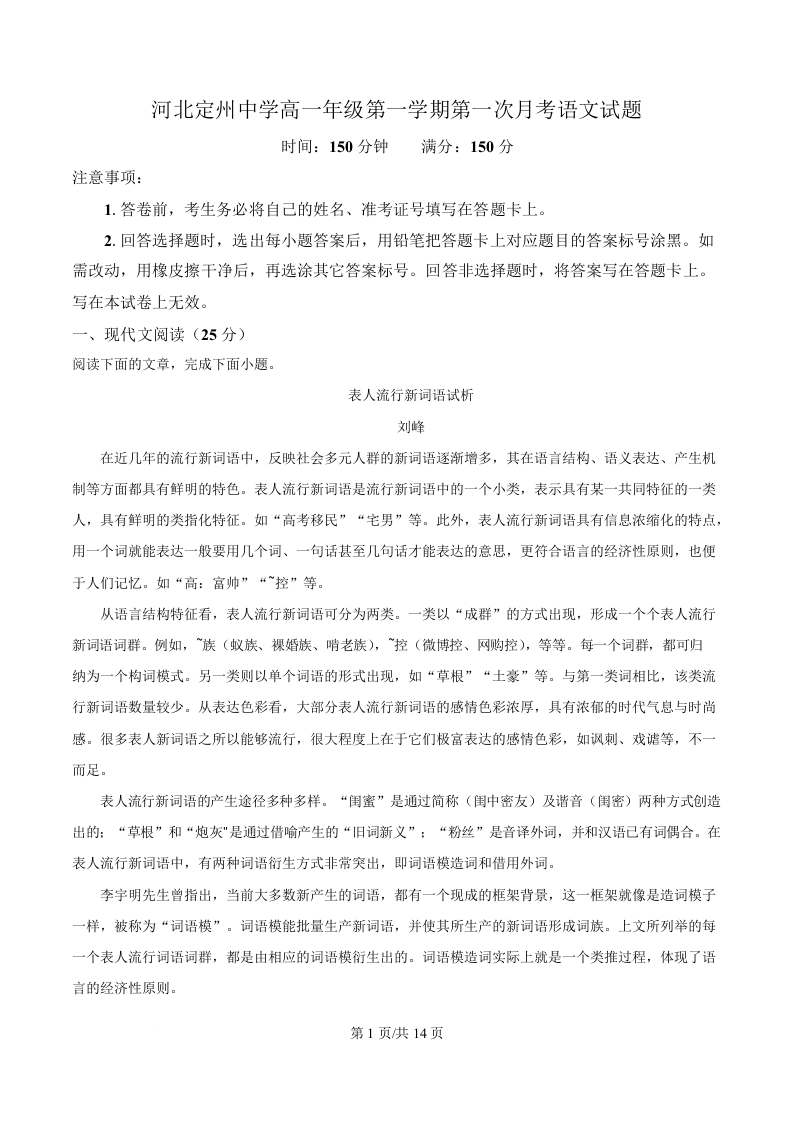 高一语文--河北省定州中学2025-2026学年高一上学期第一次月考