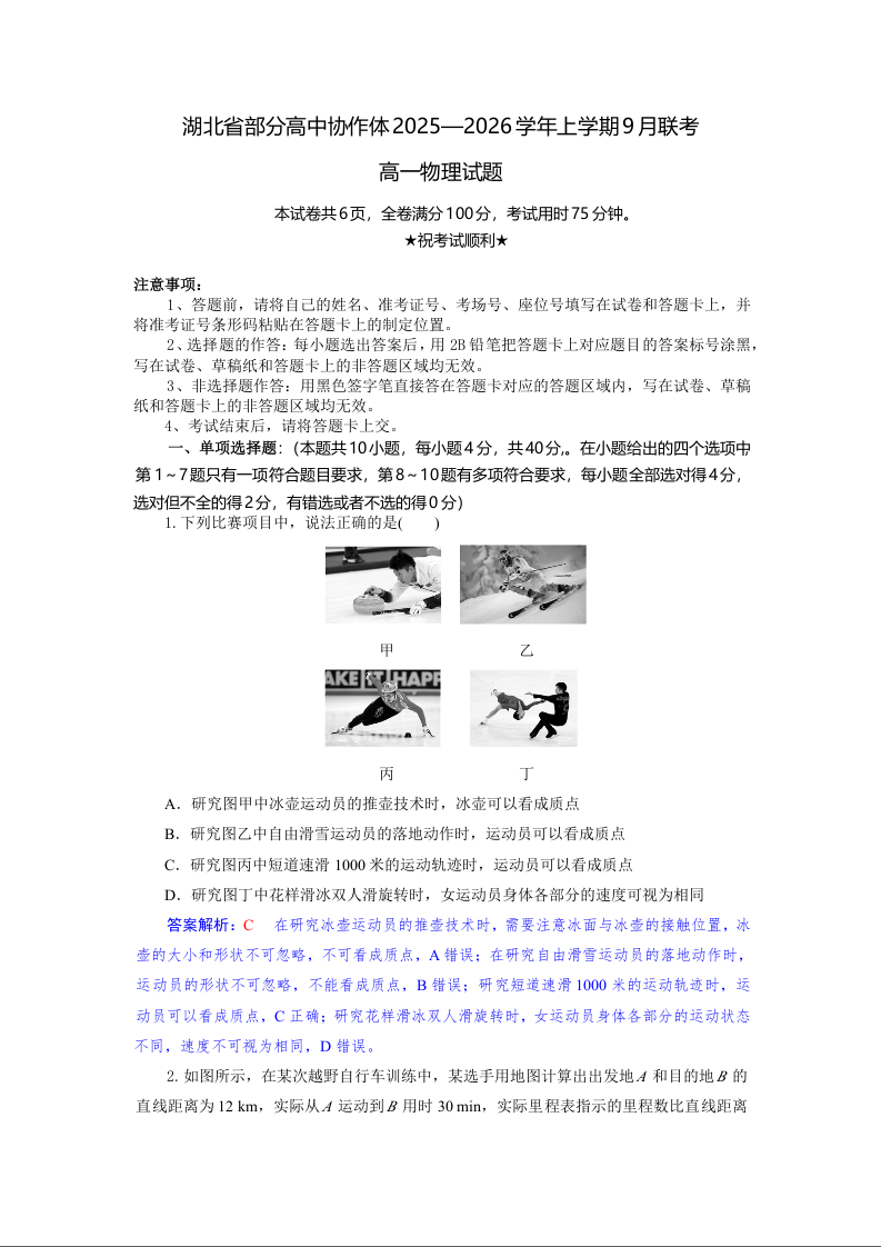 高一物理解析版--湖北省部分高中协作体2025-2026学年高一上学期9月月考