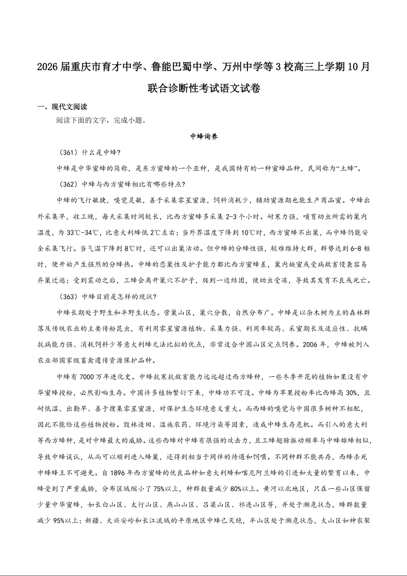 高三语文+答案--重庆育才中学、鲁能巴蜀中学、万州高级中学高2026届高三10月联合考试