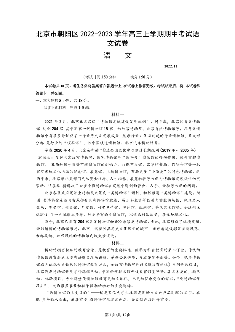 高三语文+答案--北京市朝阳区2023届高三上学期上学期期中考