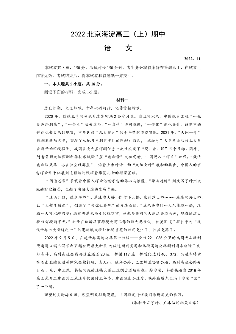 高三语文+答案--北京市海淀区2023届高三上学期期中考试