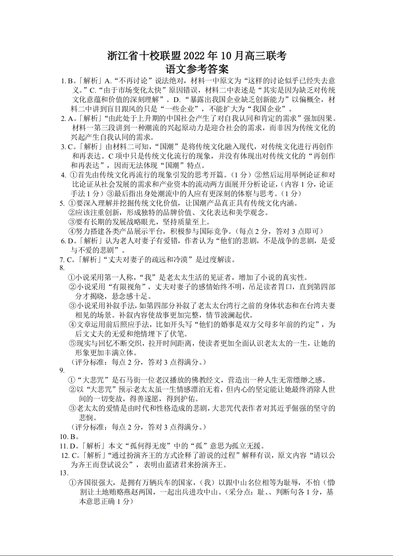 高三语文答案--浙江省十校联盟2023届高三上学期10月联考