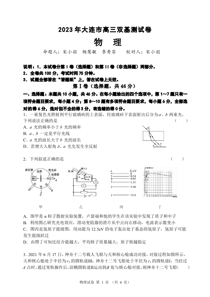 高三物理--辽宁省大连市2023届高三上学期期末双基考试