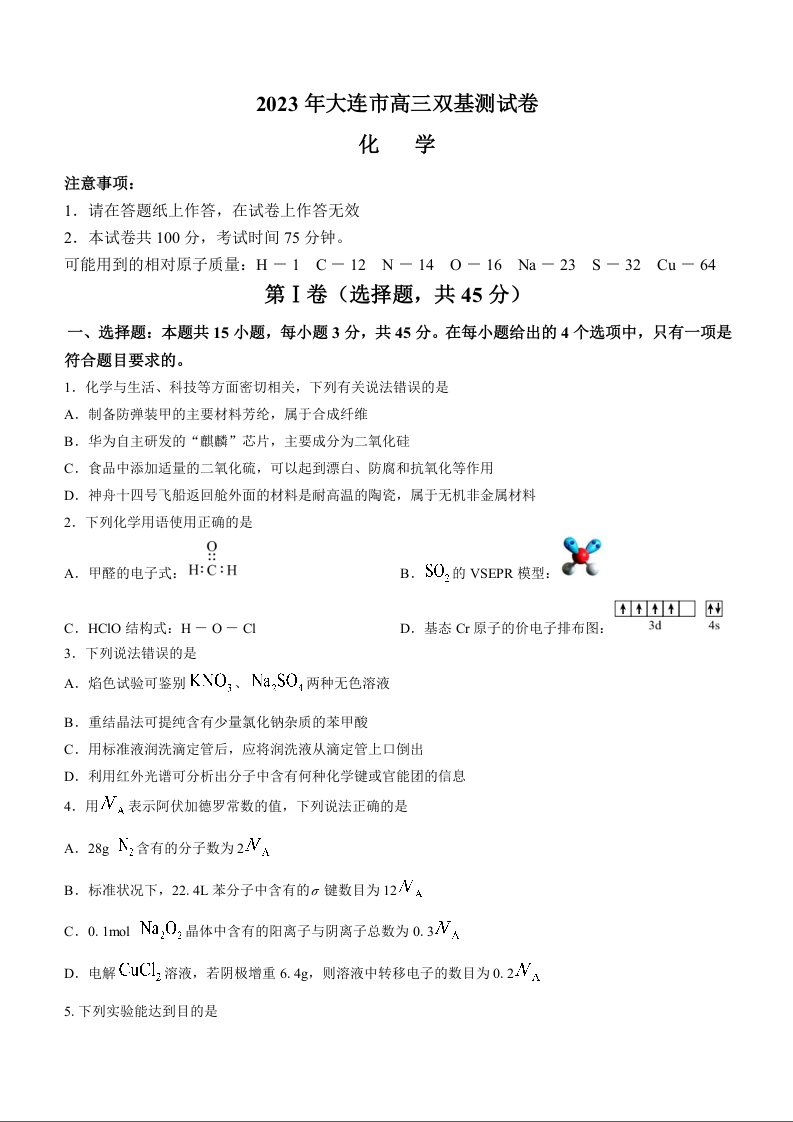高三化学+答案--辽宁省大连市2023届高三上学期期末双基考试