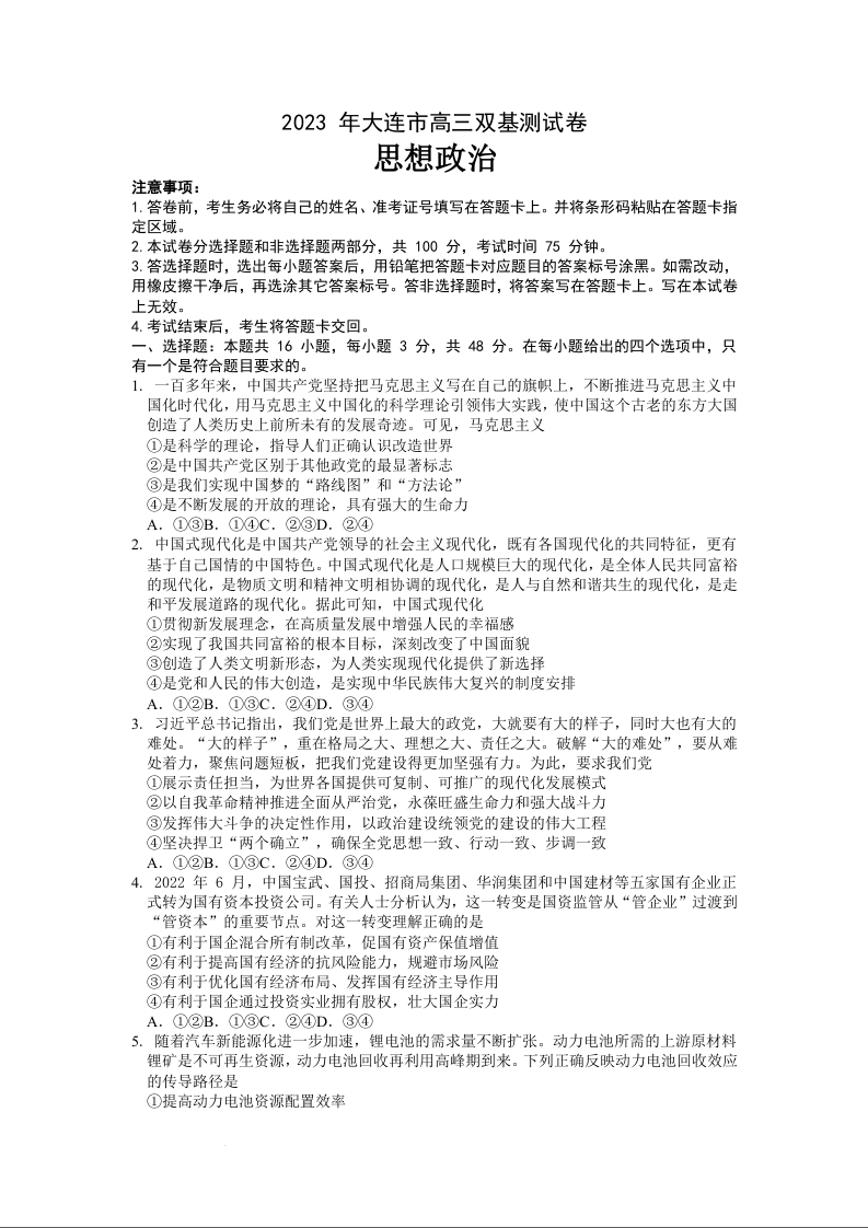高三政治--辽宁省大连市2023届高三上学期期末双基考试