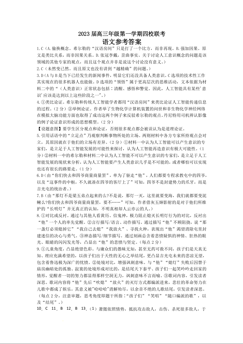 高三语文答案--江苏省盐城市四校2022-2023学年高三上学期联考