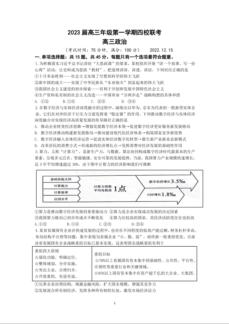 高三政治--江苏省盐城市四校2022-2023学年高三上学期联考
