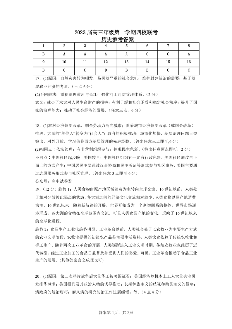 高三历史答案--江苏省盐城市四校2022-2023学年高三上学期联考