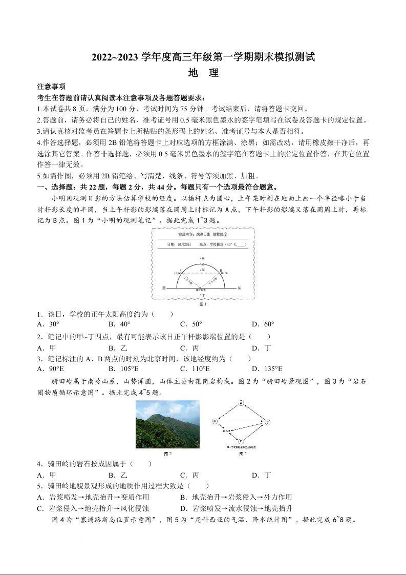 高三地理+答案--江苏省徐州市2022-2023学年高三上学期期末模拟测