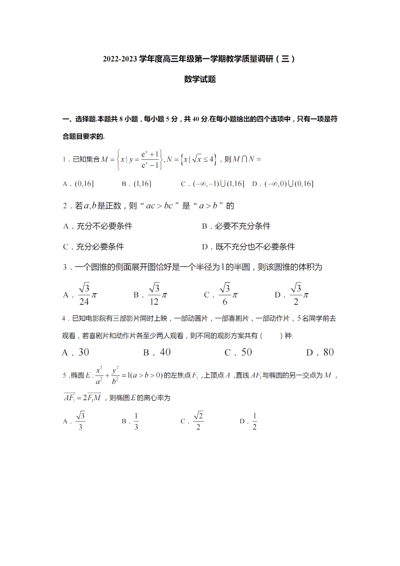 高三数学(原卷版)--江苏省南通市如皋市2022-2023学年高三上学期教学质量调研(三)