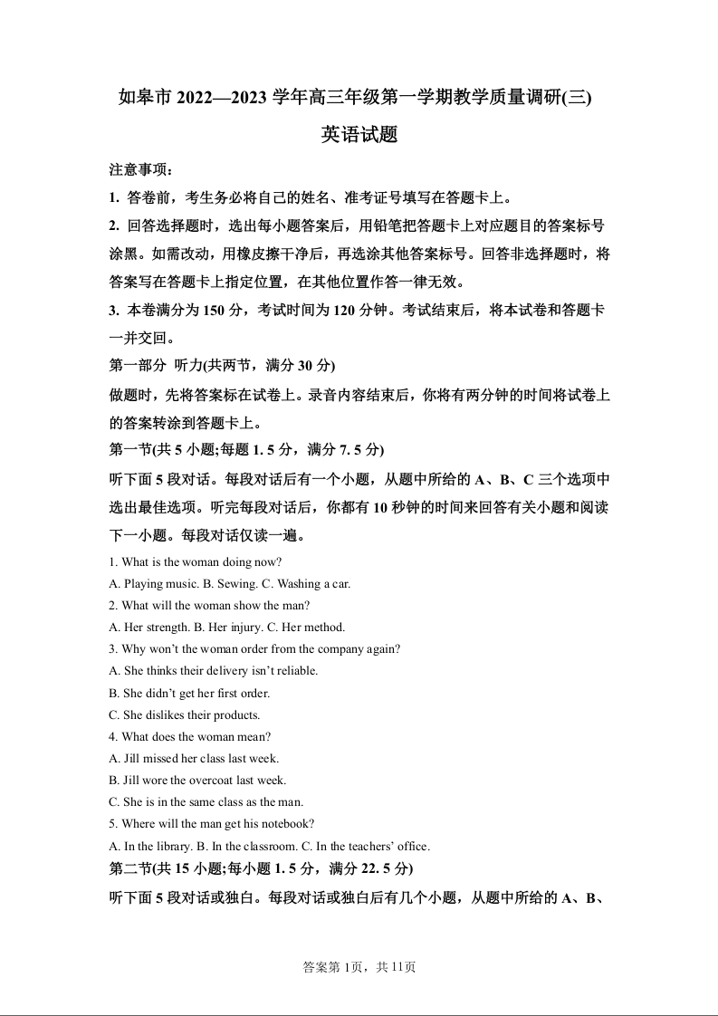 高三英语+答案--江苏省南通市如皋市2022-2023学年高三上学期教学质量调研(三)