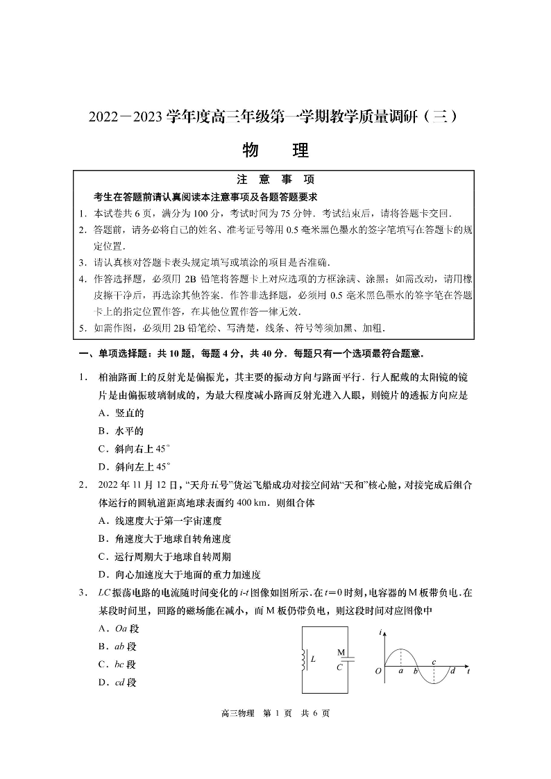 高三物理--江苏省南通市如皋市2022-2023学年高三上学期教学质量调研(三)