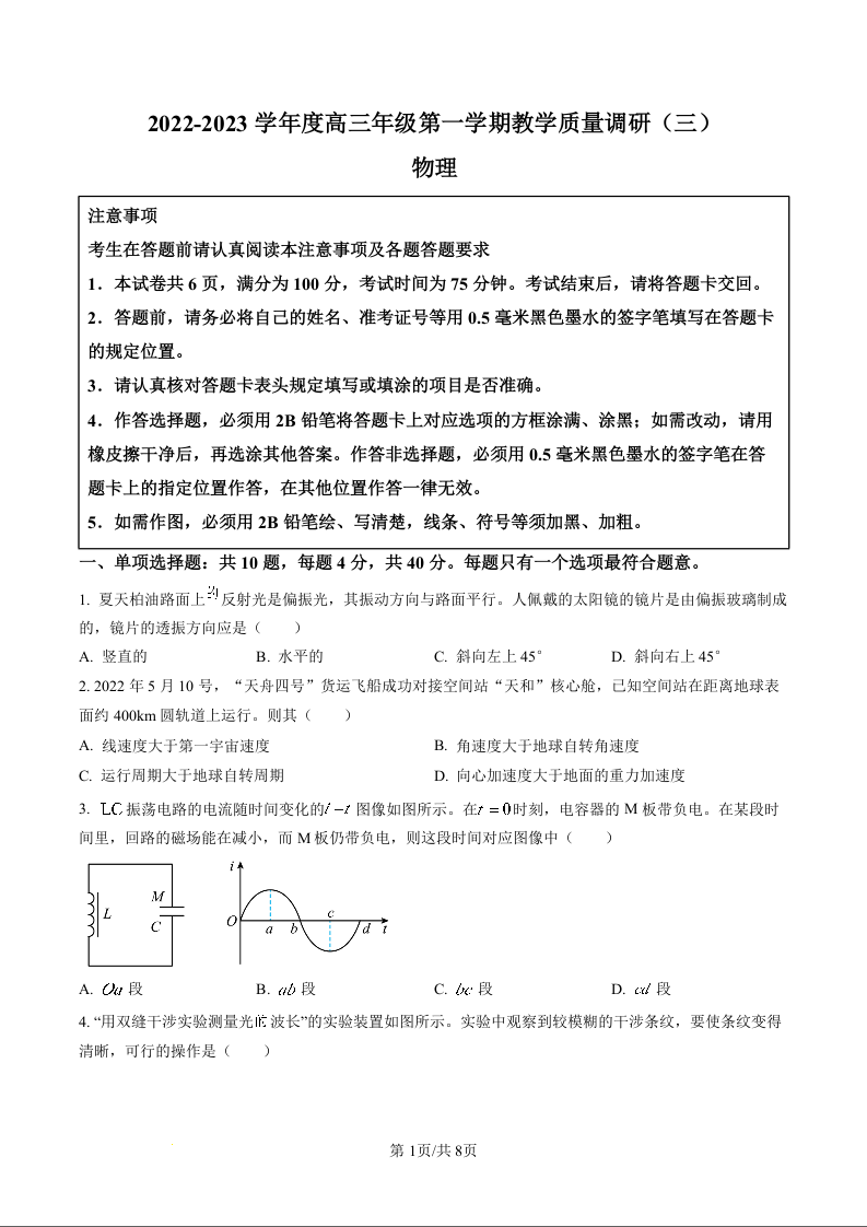 高三物理答案--江苏省南通市如皋市2022-2023学年高三上学期教学质量调研(三)