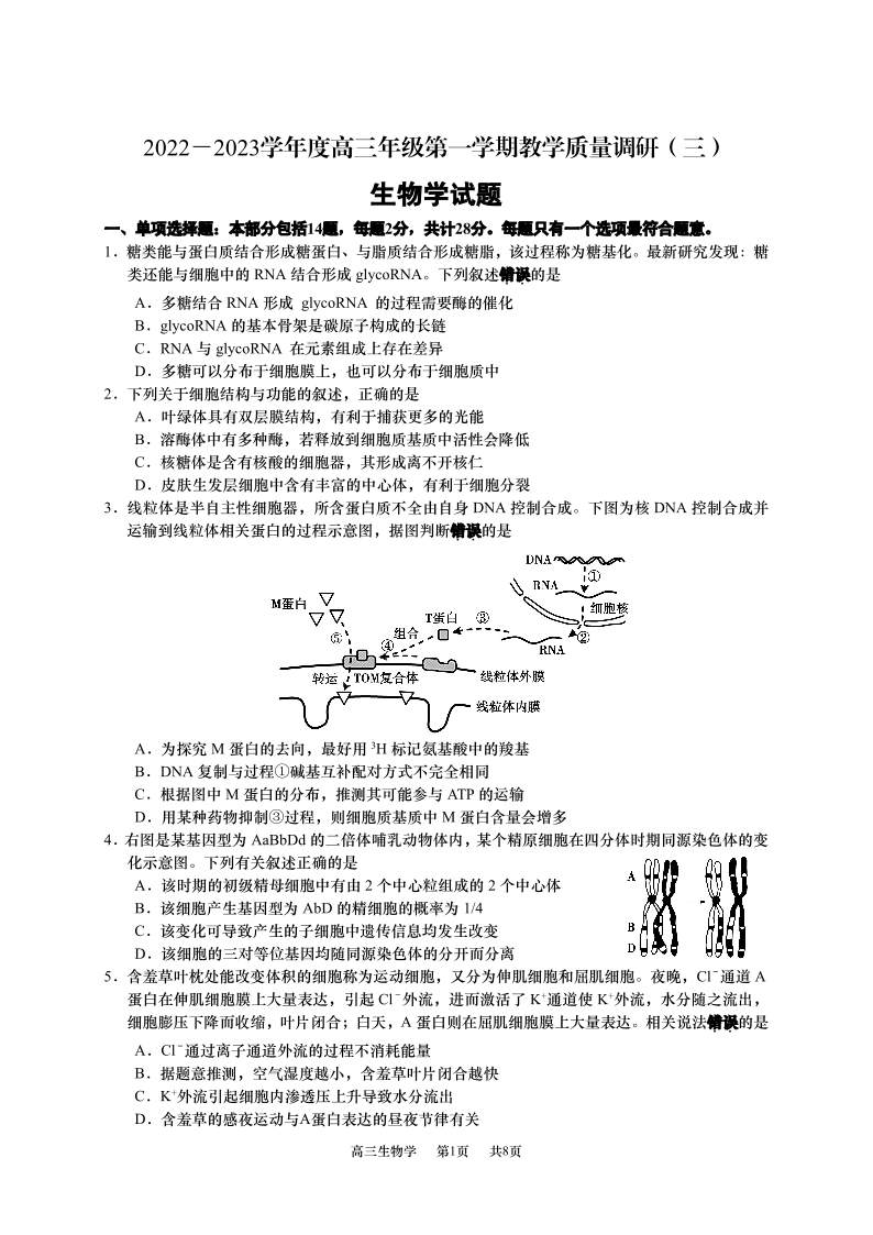 高三生物--江苏省南通市如皋市2022-2023学年高三上学期教学质量调研(三)