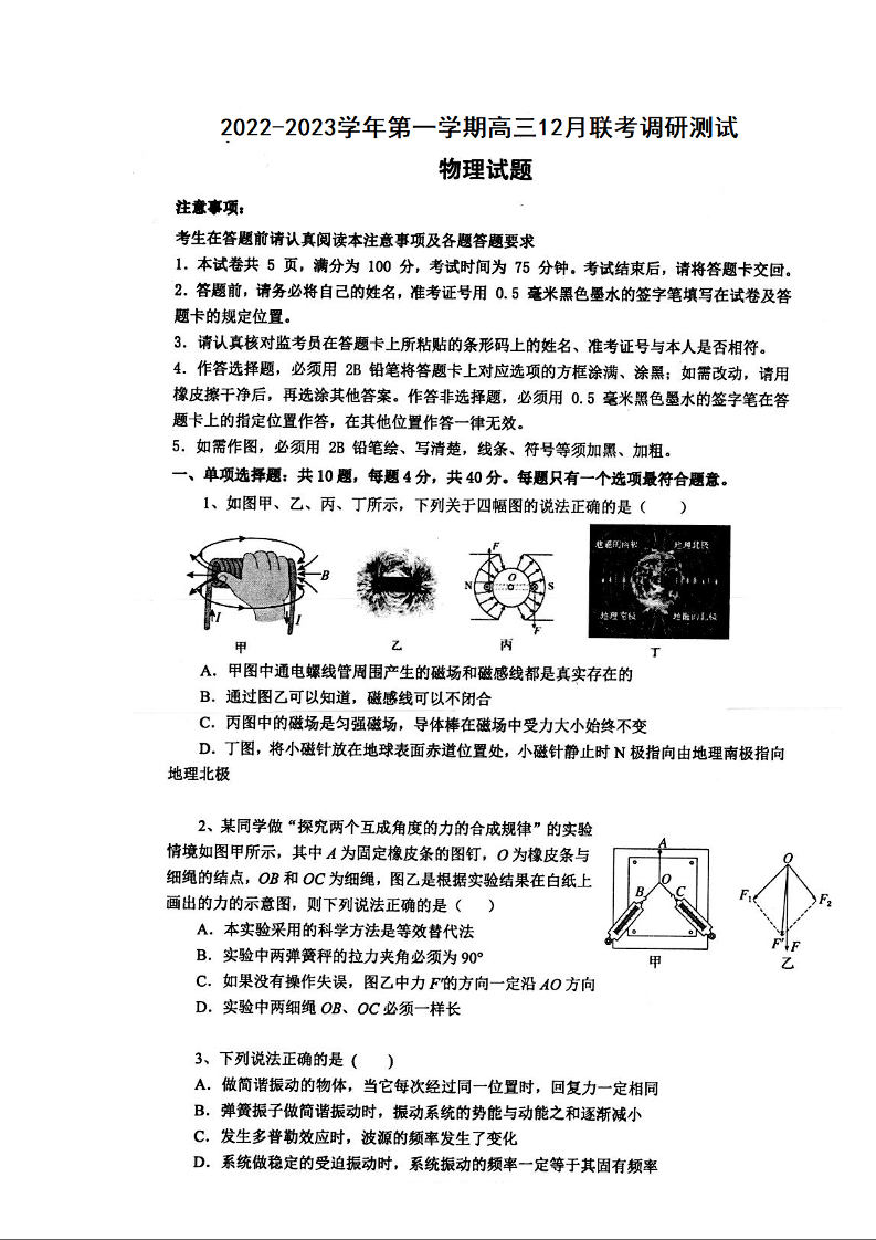 高三物理--江苏省南通市高三2023届上学期12月调研测试