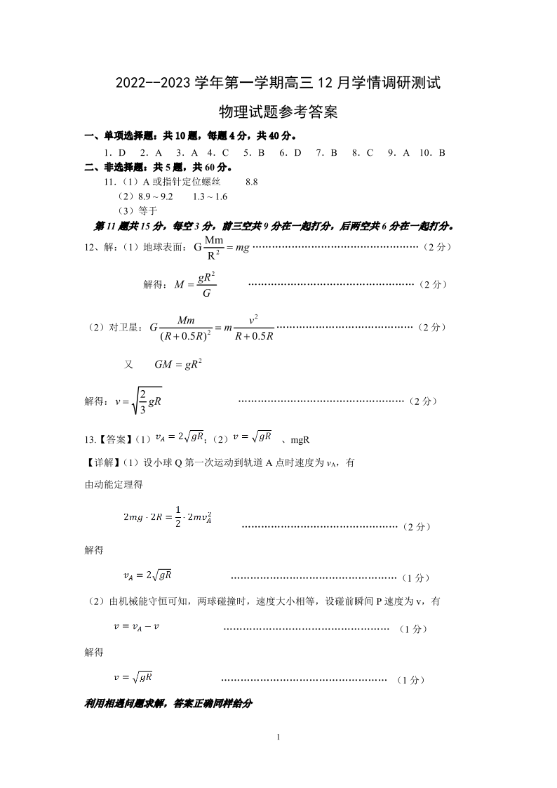 高三物理答案--江苏省南通市高三2023届上学期12月调研测试