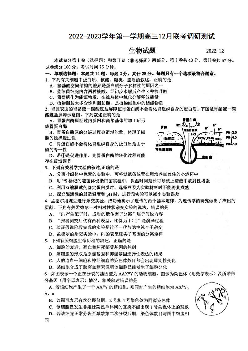 高三生物+答案--江苏省南通市高三2023届上学期12月调研测试