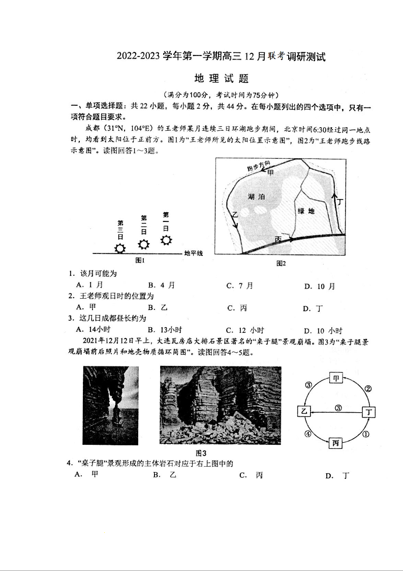高三地理+答案--江苏省南通市高三2023届上学期12月调研测试