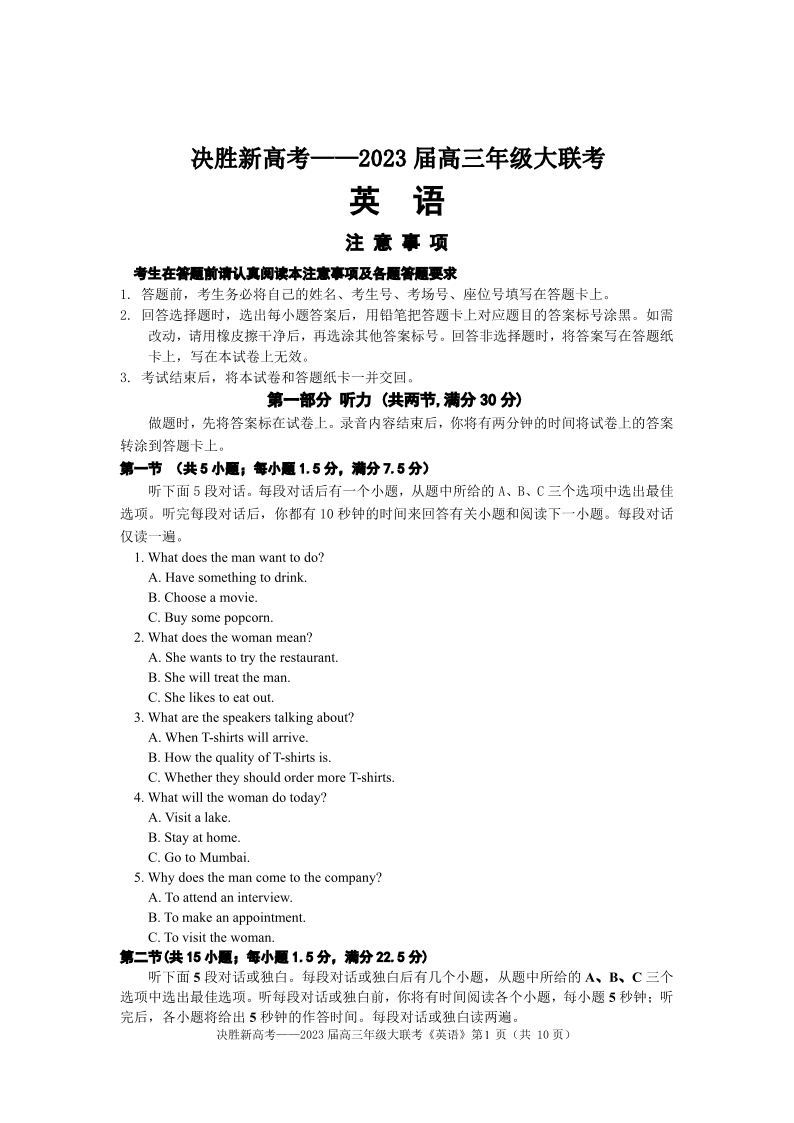 高三英语--江苏省决胜新高考2023届高三上学期12月第四次大联考