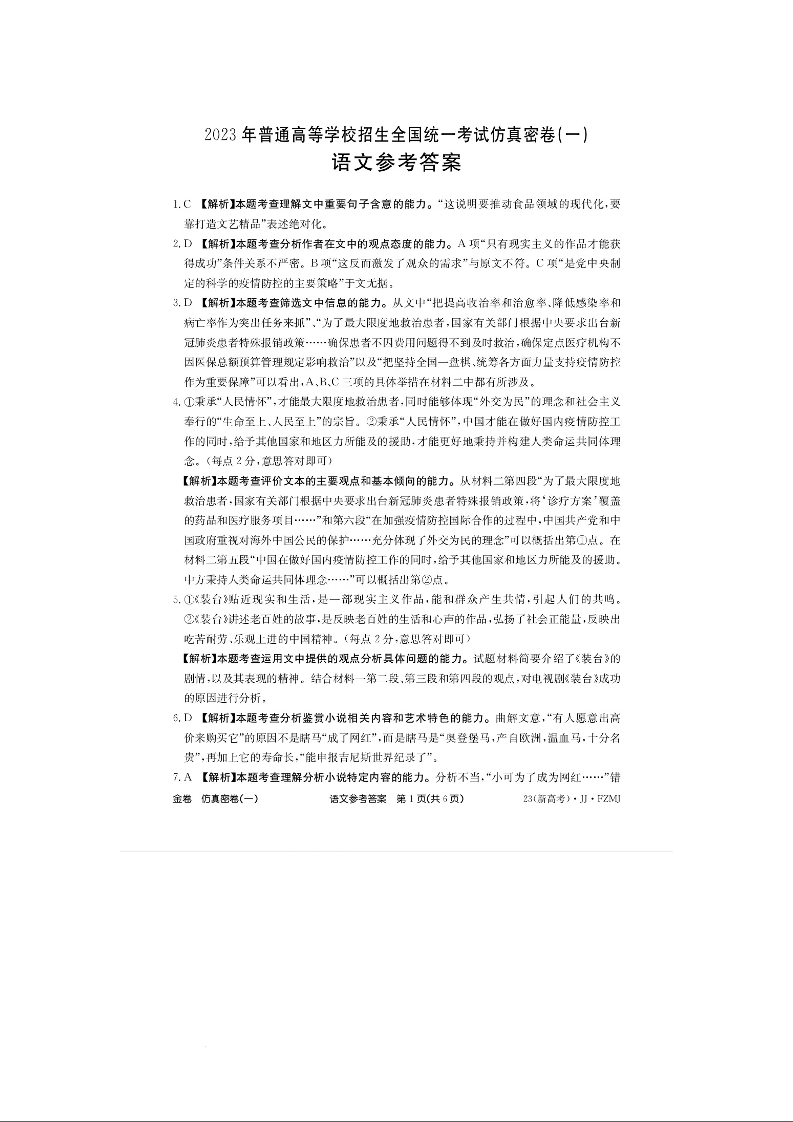 高三语文答案--湖南省普通高中2023年学业水平选择性考试仿真密卷(一)(新教材新高考)